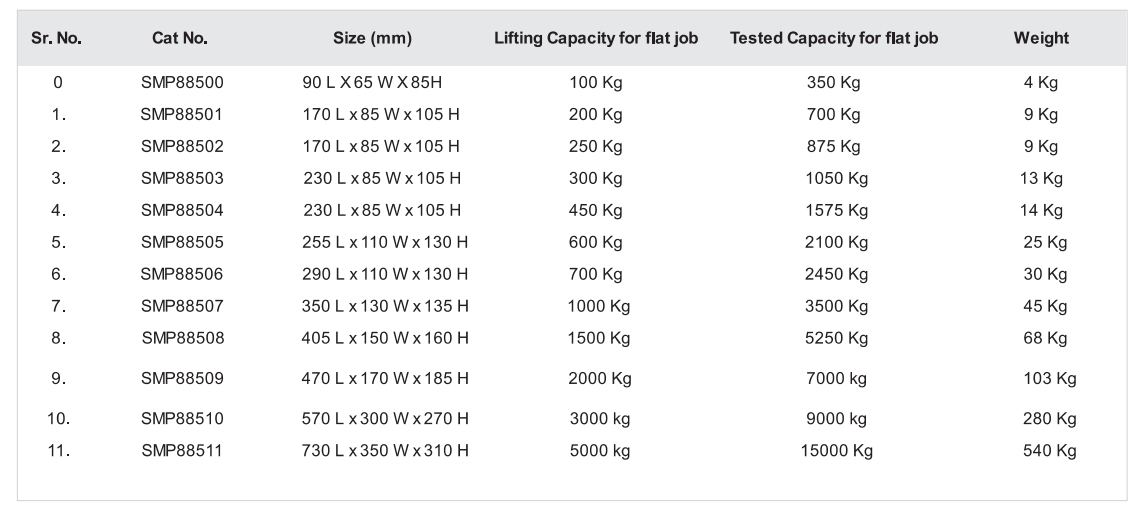 Used for lifting & handling of steel plates, heavy block & castings as well as heavy round or cylindrical parts .